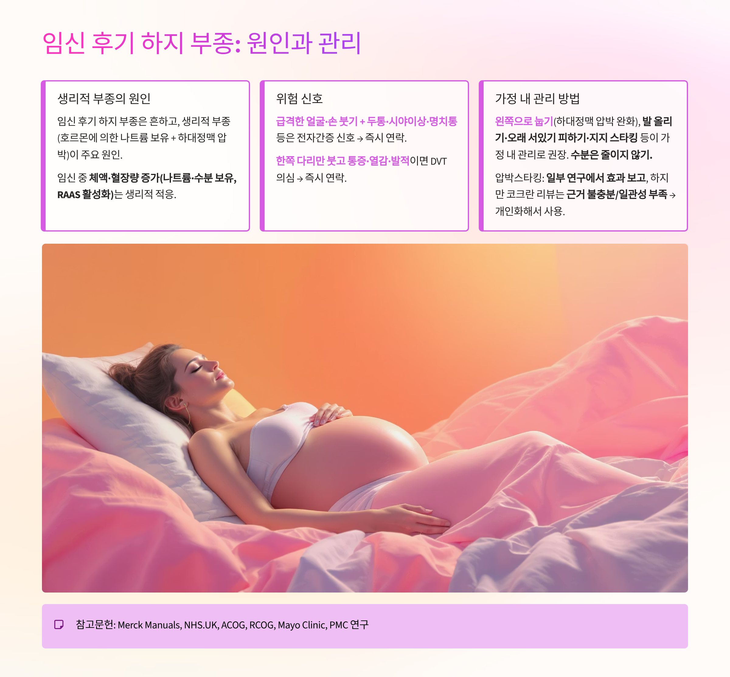 | 정상적 부종 | 저녁에 심해지고 아침에 가라앉음, 양쪽 발/발목 대칭 | 임신성 체액 증가·정맥 압박 | 자세·운동·휴식으로 관리 |